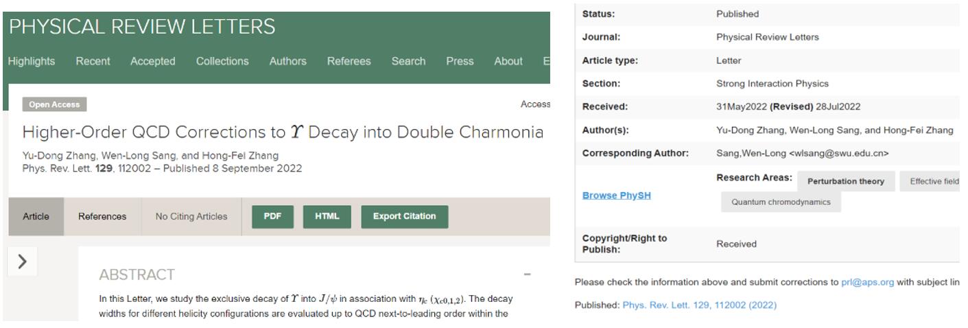 近日成人视频 强子物理团队桑文龙教授与成人视频张余栋同学及贵州财经大学的张鸿飞老师在物理学顶级期刊《物理评论快报》(PRL)上发表题为“Higher-order QCD corrections to Upsilon decay into double charmonia”的科研工作,成人视频 为该成果的第一及唯一通讯作者完成单位,其中张余栋同学为第一作者,桑文龙老师为唯一通讯作者。该研究工作得到了国家自然科学基金面上基金资助。